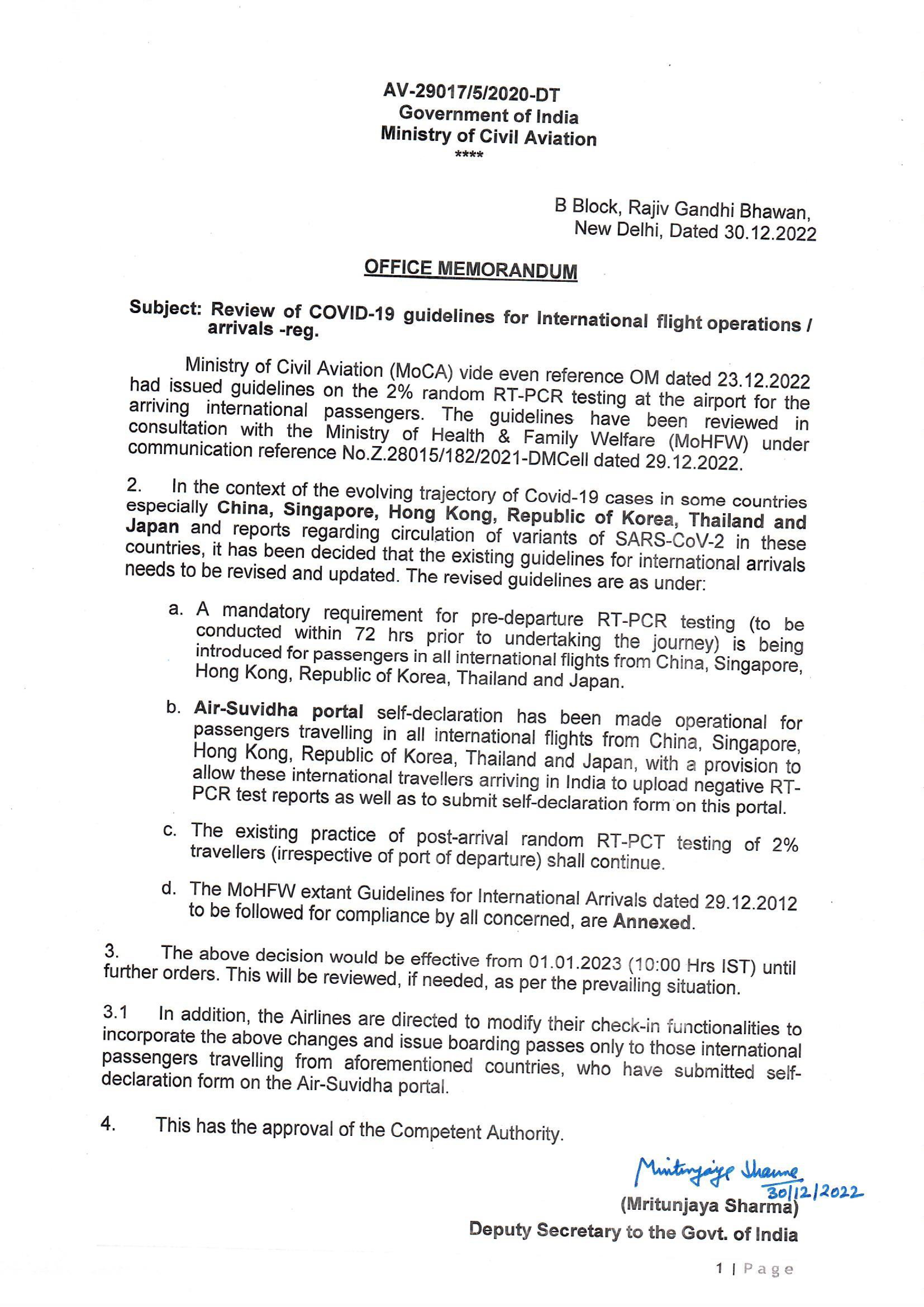 COVID19 UPDATE - International passengers travelling from China, Hong Kong, Japan, South Korea, Singapore and Thailand to India to undergo mandatory RTPCR tests before departure and upload report on Air Suvidha portal from 1“ January 2023